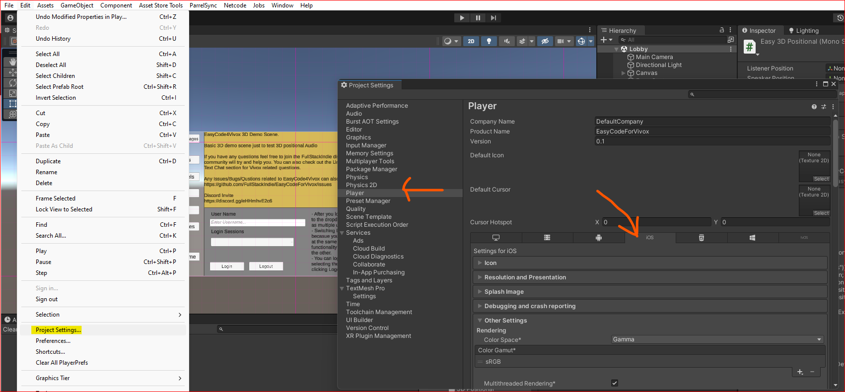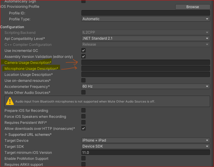 In order to access Microphone on **iOS** you need to edit **Info.plist**. Unity provides easy access in the **Player Settings**